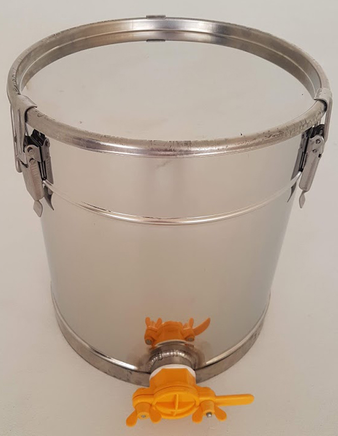 Depósito metálico prateado com válvula amarela e fechos laterais