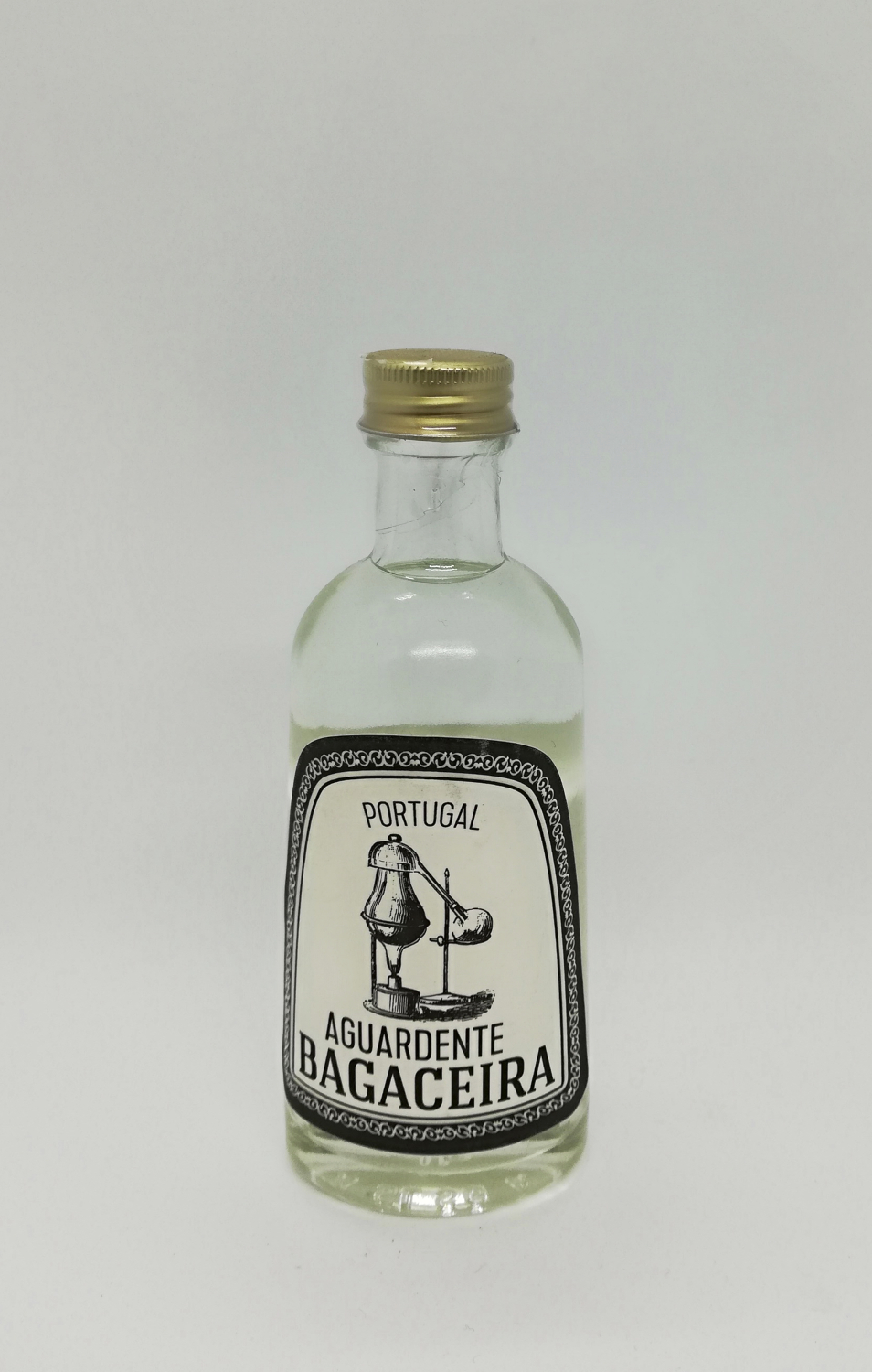 Garrafa de aguardente em vidro com rótulo preto e branco