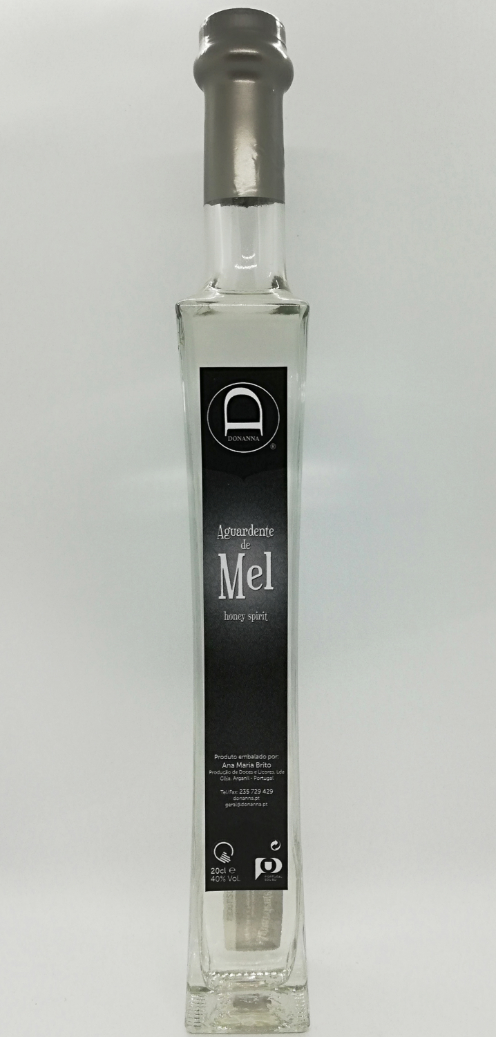 Garrafa alta de aguardente de mel Domanna com rótulo preto