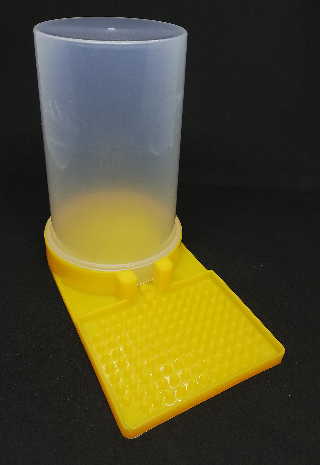 Dispensador amarelo e branco para alimentos de animais com reservatório translúcido