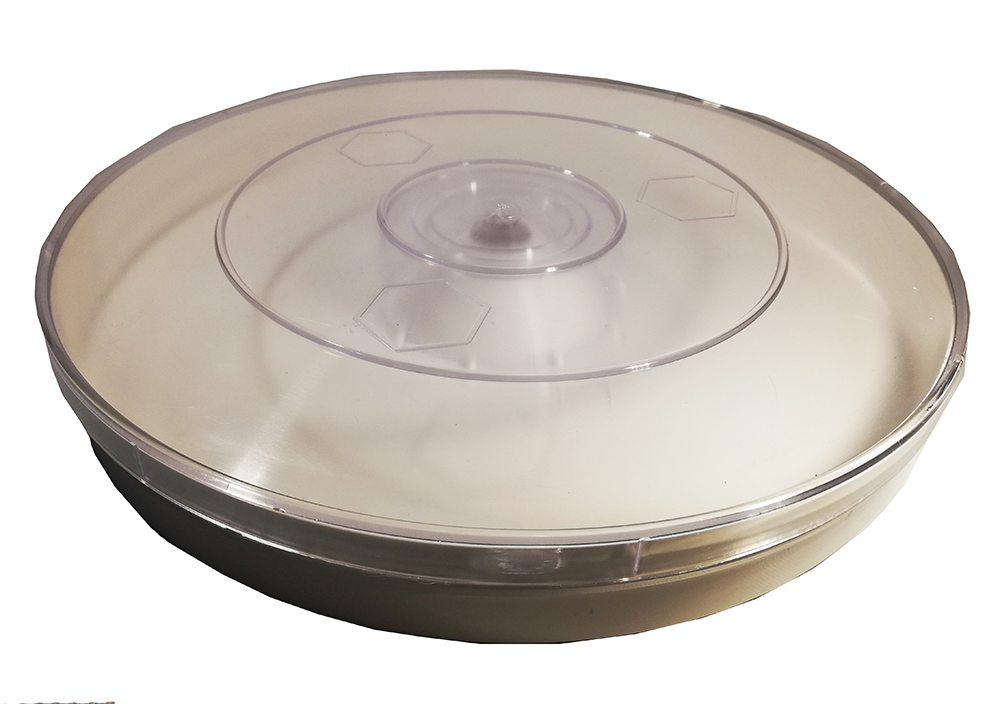 Caixa redonda para guardar CDs ou DVDs com tampa transparente e base branca