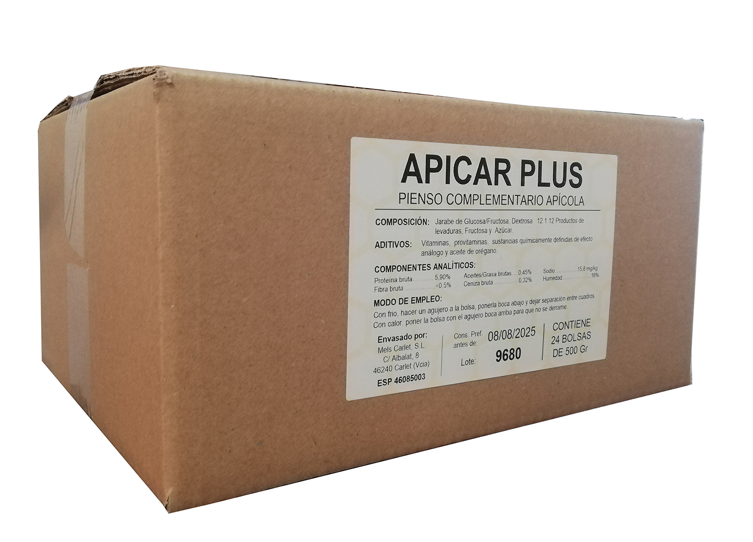 Caixa de papelão com etiqueta do produto Apicar Plus para alimentação apícola