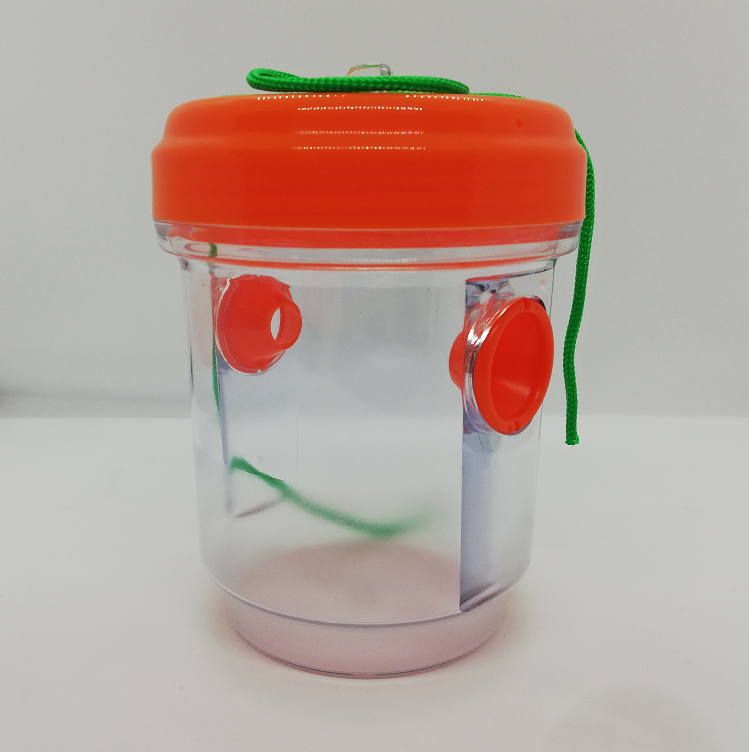Recipiente transparente com tampa laranja e cordão verde