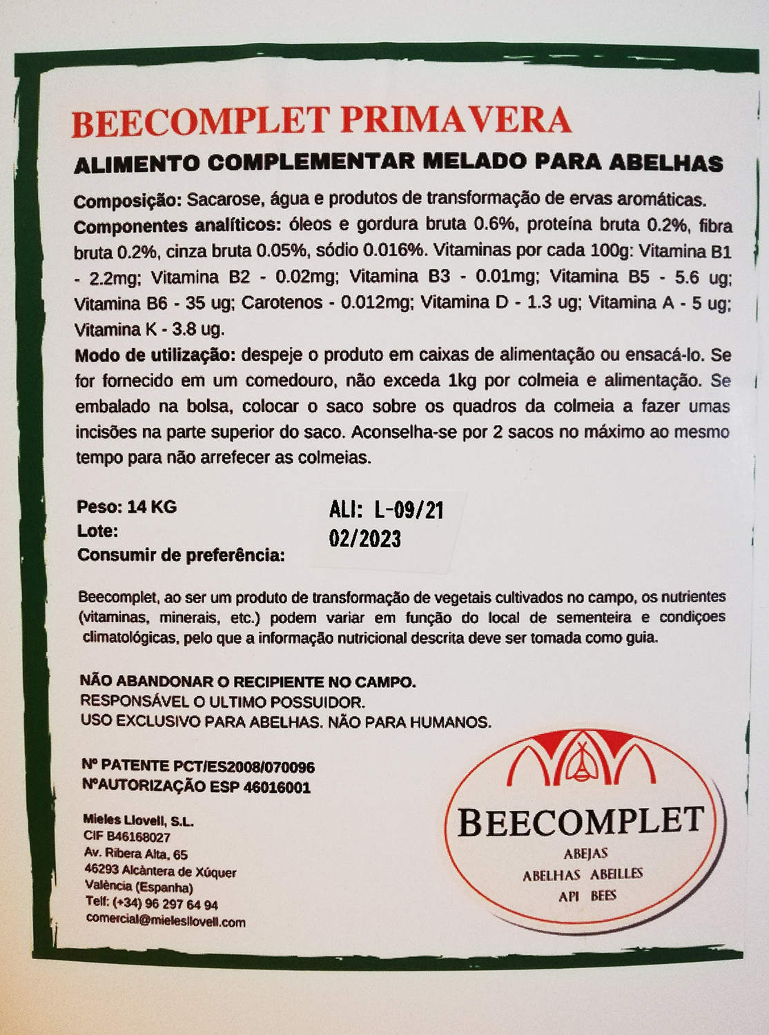 Etiqueta de alimento melado para abelhas BEECOMPLET PRIMAVERA com texto detalhado