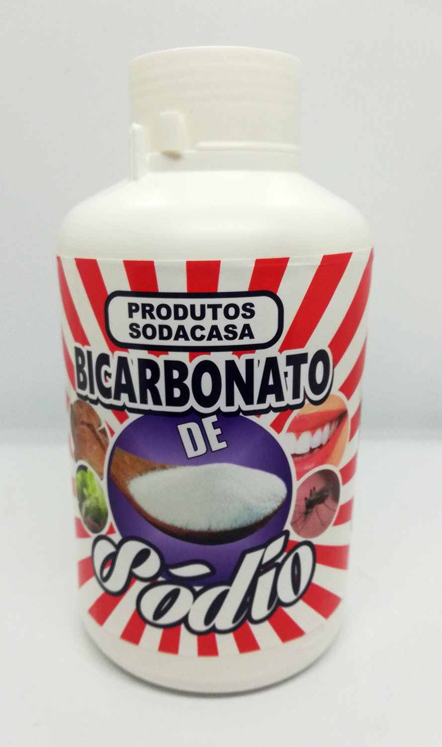 Frasco de plástico branco com rótulo vermelho e branco de bicarbonato de sódio