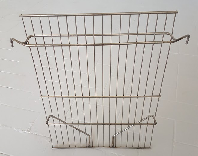 Estrutura metálica em arame inox com ganchos e suportes em fundo branco