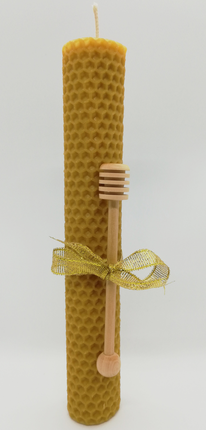 Vela cilíndrica de cera de abelha com textura de favos e melher de madeira