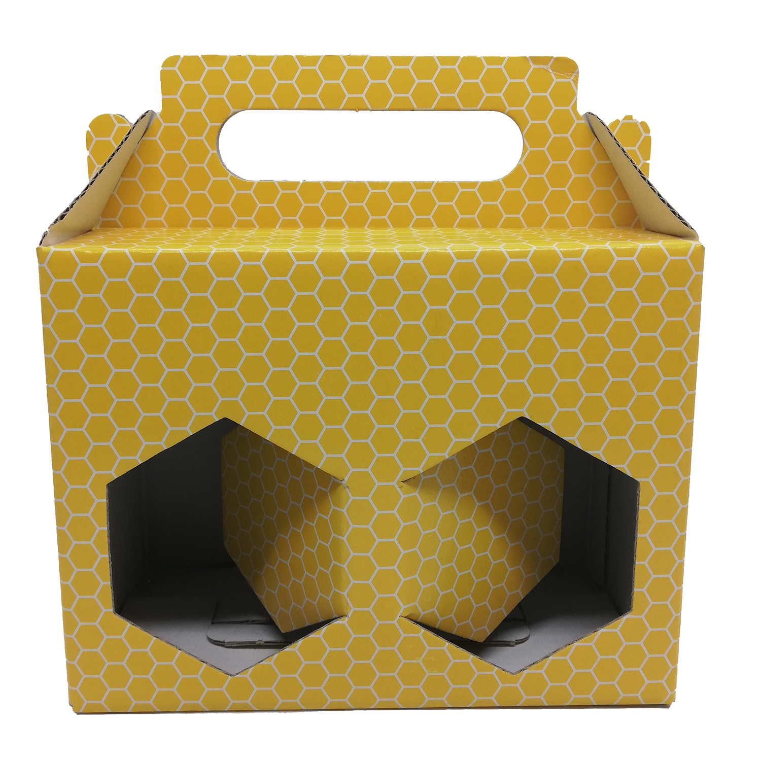 Caixa de cartão amarela com padrão de favo de mel e aberturas hexagonais