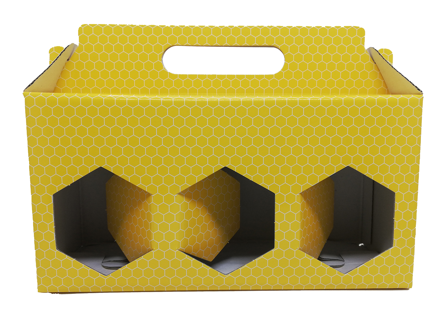 Caixa de cartão amarelo com padrão de células hexagonais e três recortes hexagonais frontais.