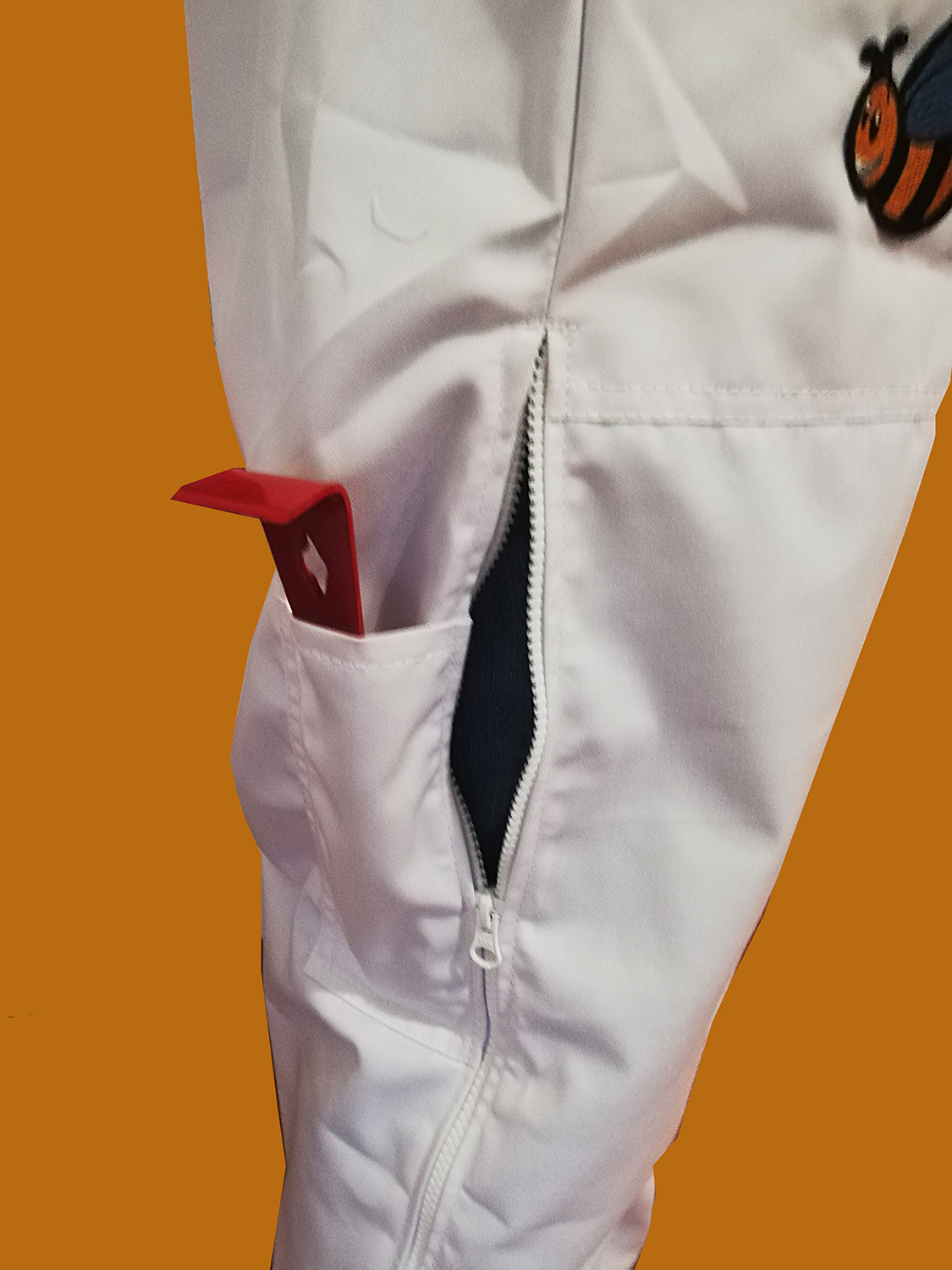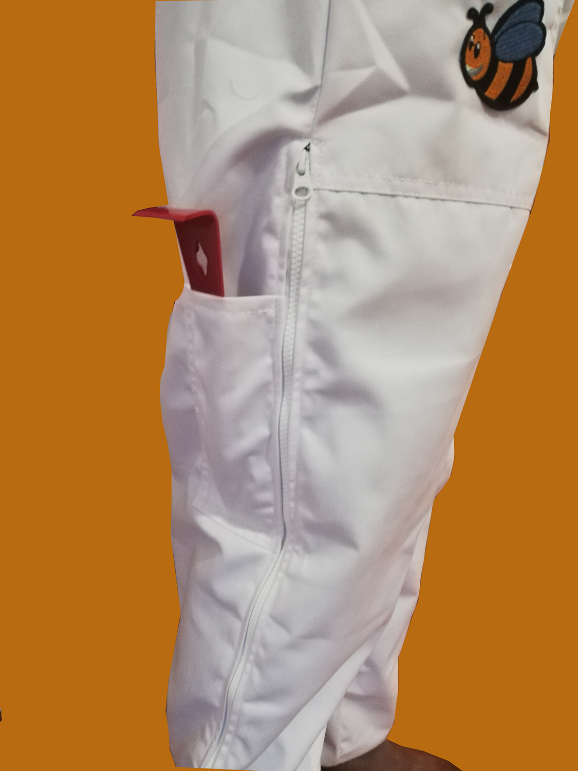 Calças brancas com bolso lateral, ferramenta vermelha e abelha bordada