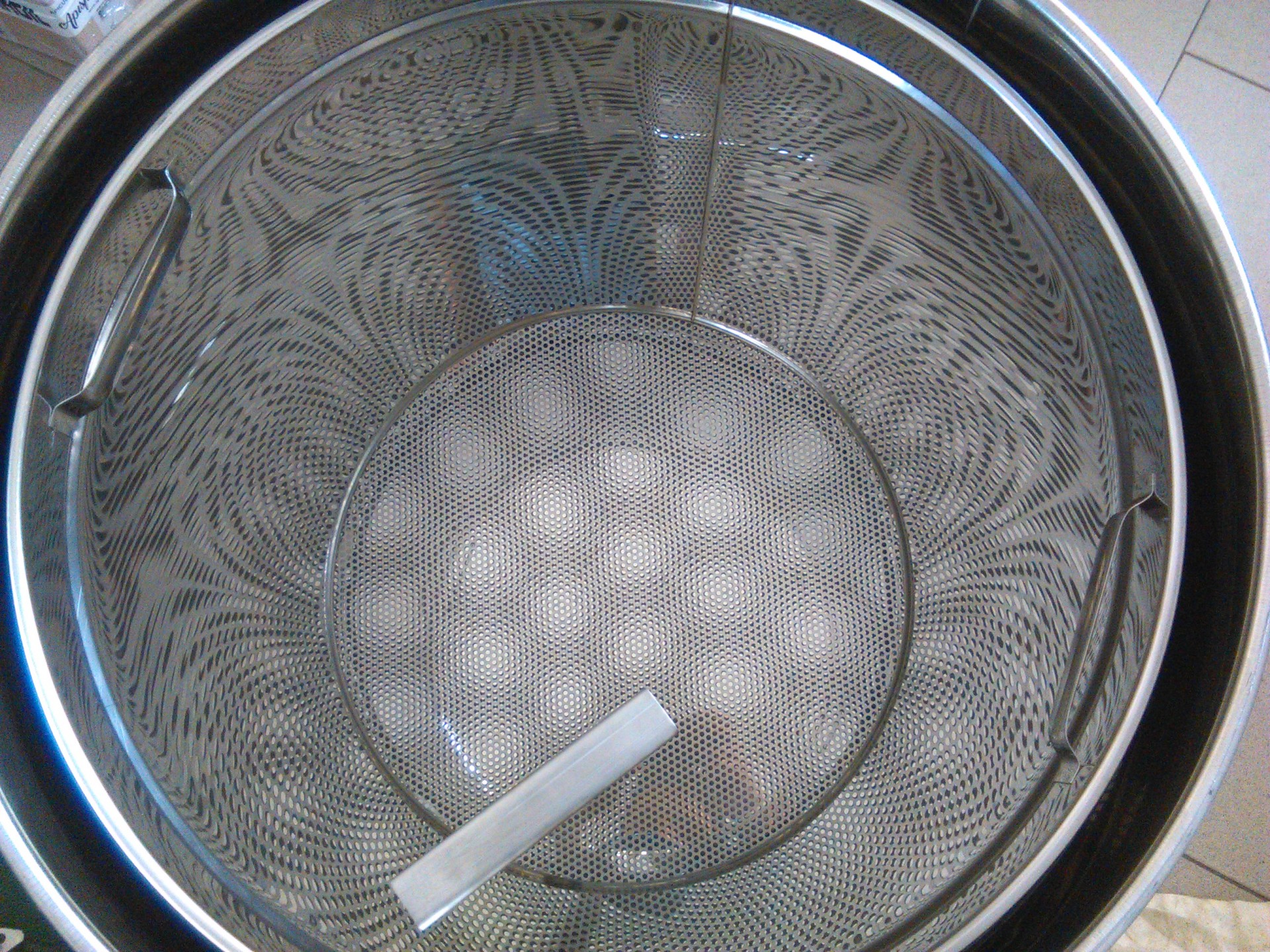 Cesto metálico perfurado redondo com pegas dentro de um recipiente metálico