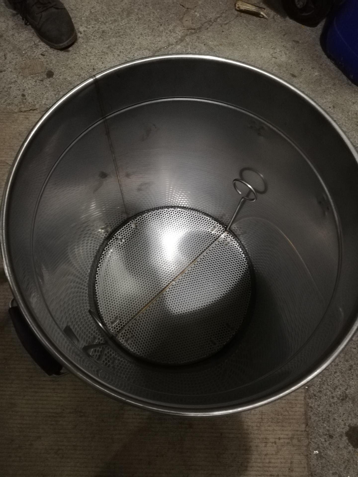 Balde metálico cilíndrico com peça perfurada no fundo e haste com argola