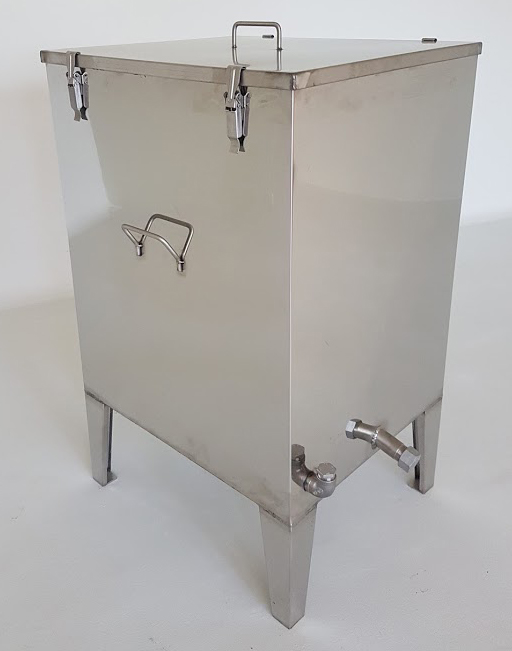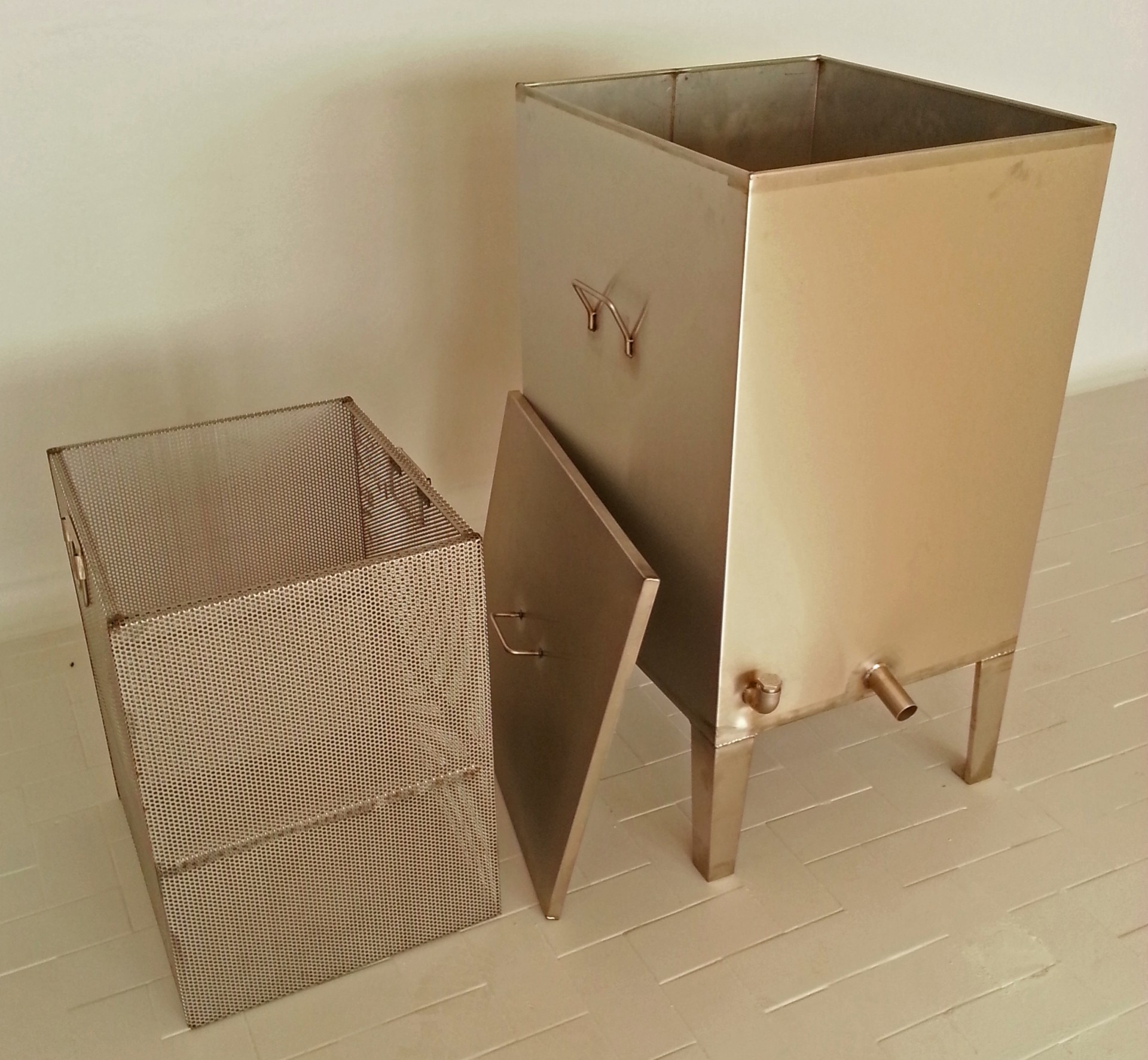Cuba metálica retangular com torneira, tampa e cesto de malha todos prateados