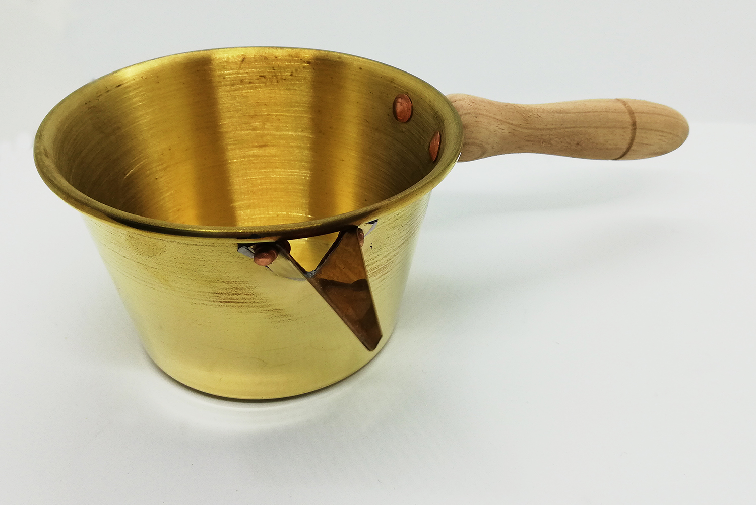 Caçarola dourada pequena com cabo de madeira