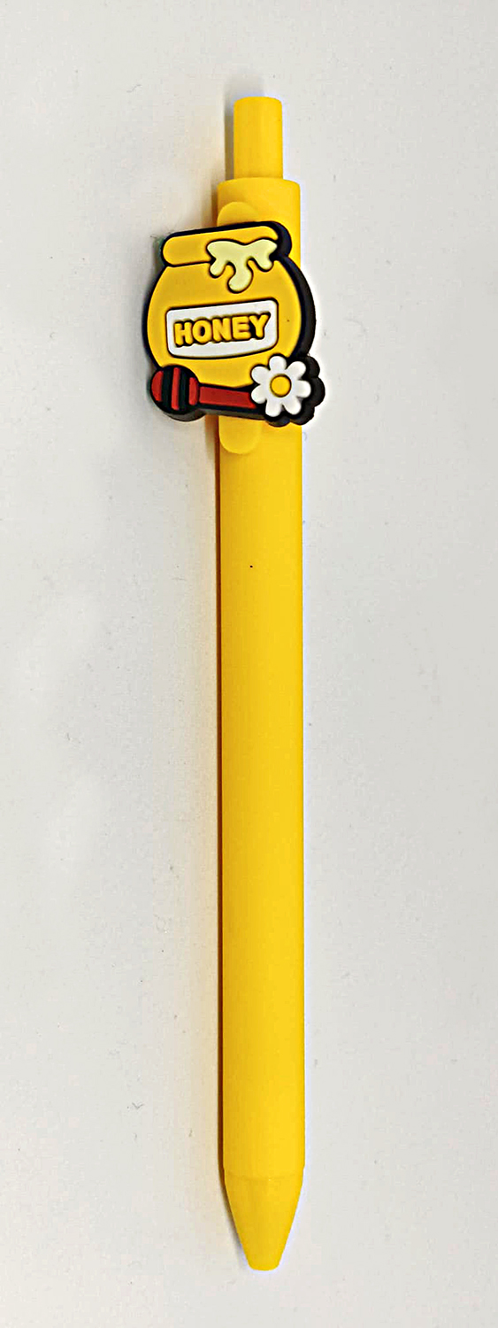 Caneta amarela com clip decorativo de pote de mel com a palavra HONEY