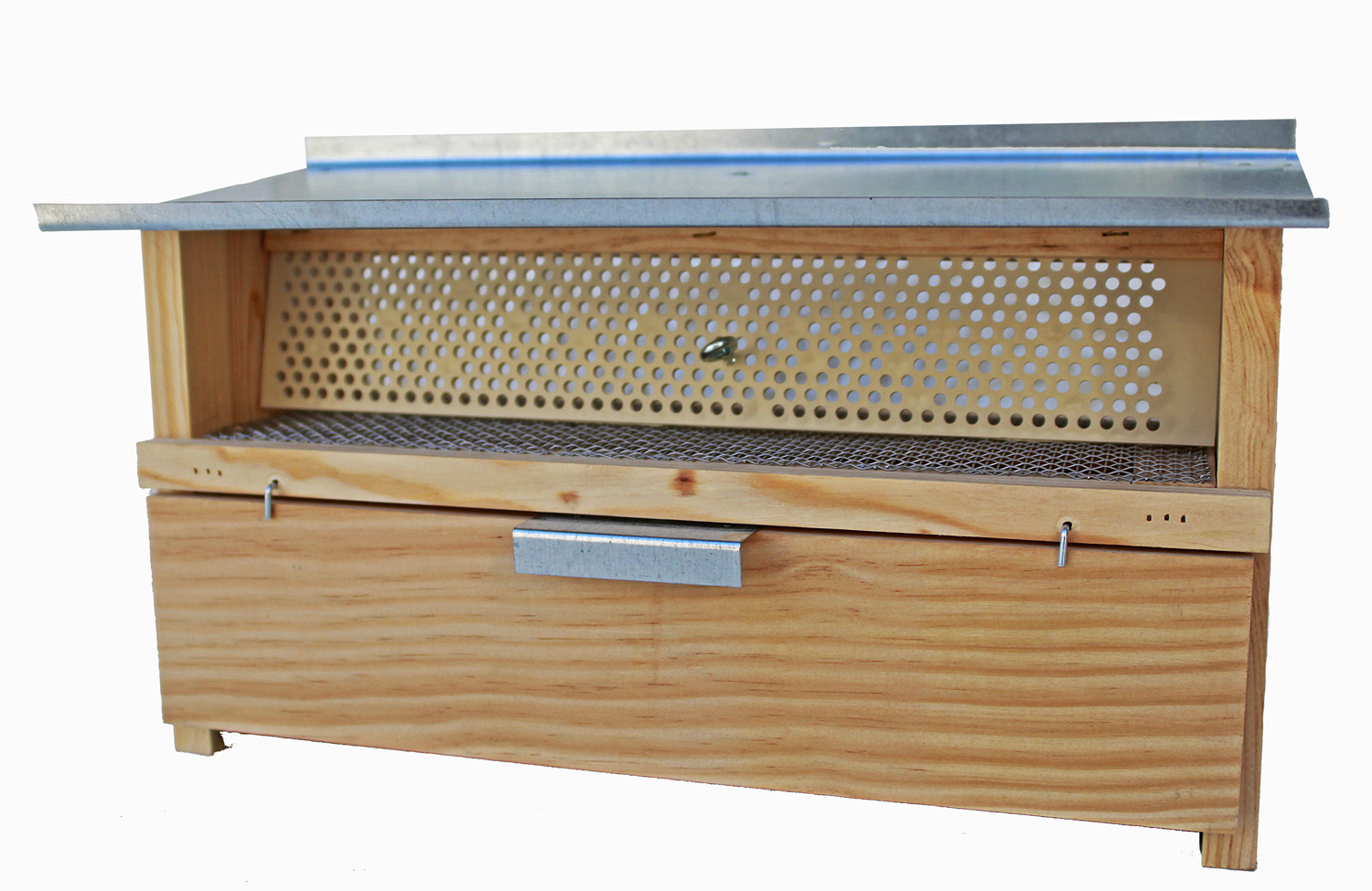 Colmeia de madeira com tampa metálica e grelha perfurada