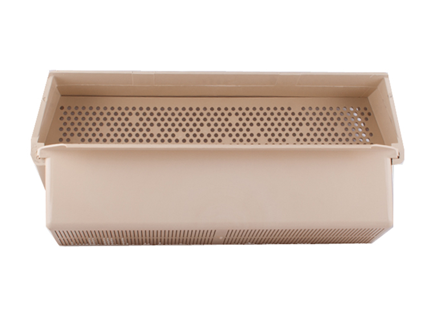 Recipiente retangular de plástico bege com tampas perfuradas e fundo branco