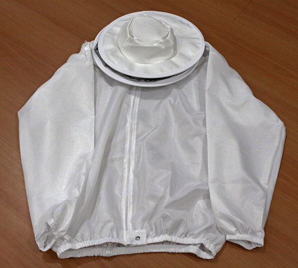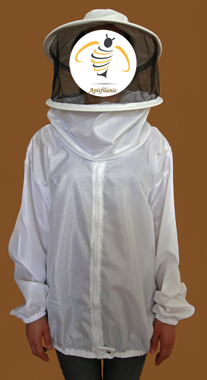 Casaco branco de apicultor com véu em malha preta e chapéu com logótipo