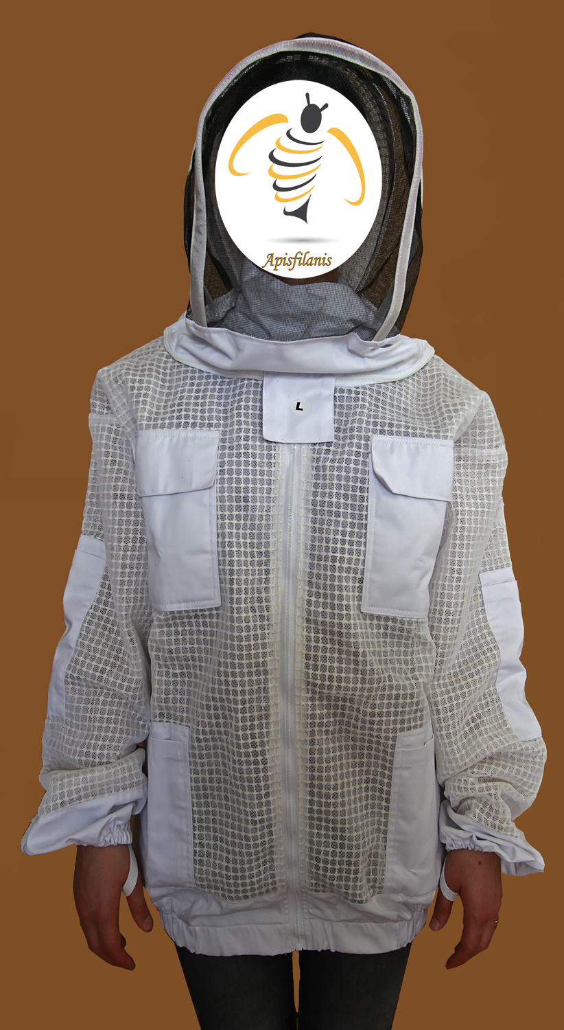 Roupa de apicultor branca com chapéu e tela de proteção preta em fundo castanho