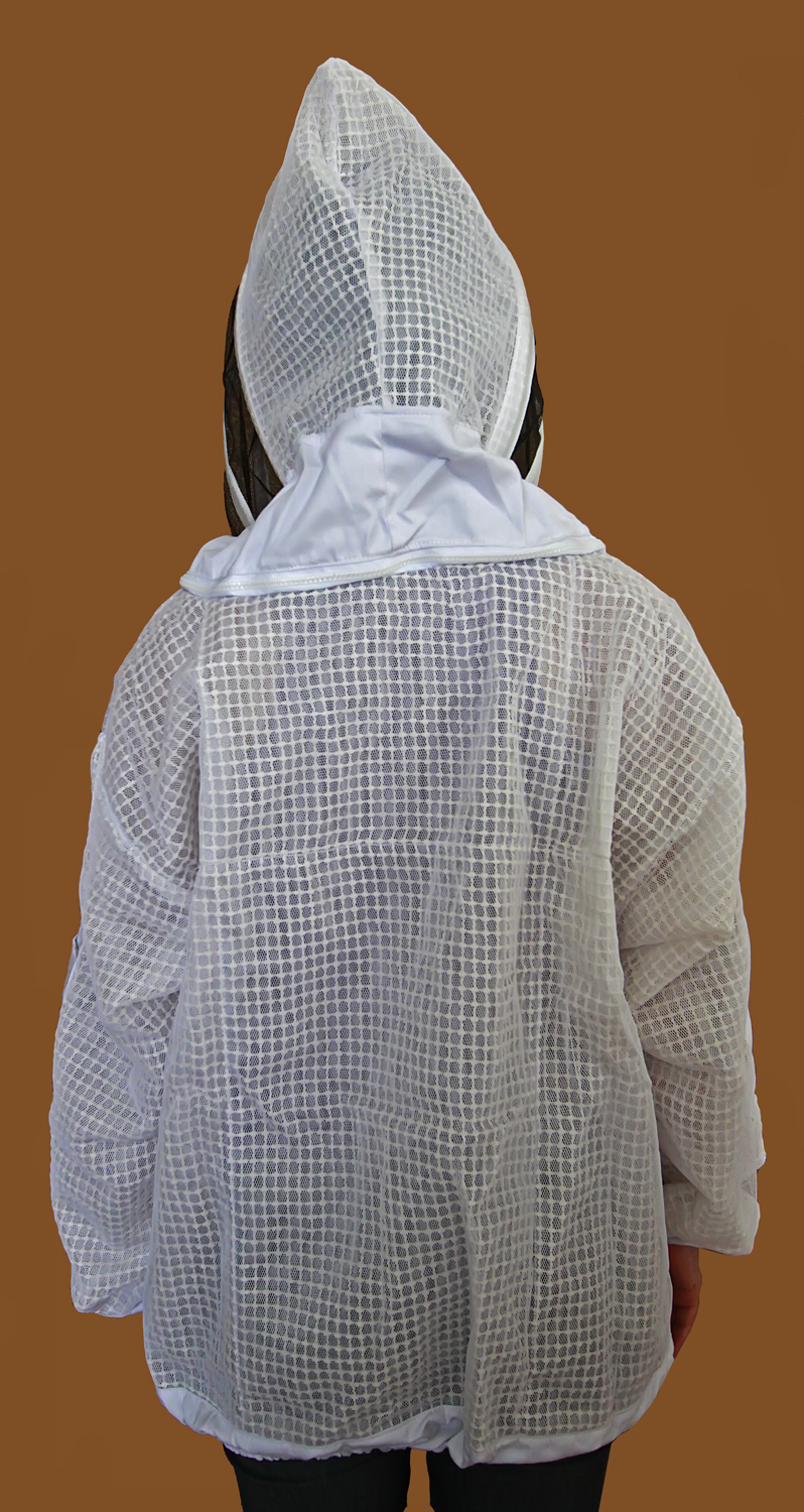 Fato de apicultor branco com proteção de tela preta na cabeça visto de costas