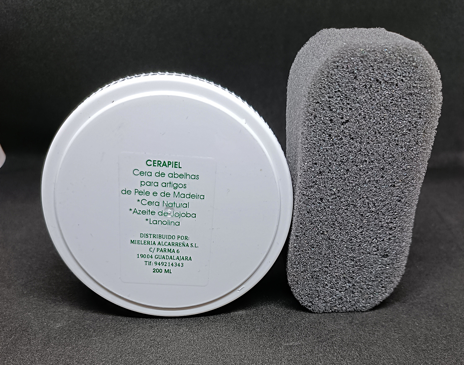 Frasco branco de cera de abelhas CERAPIEL e esponja cinzenta sobre superfície escura