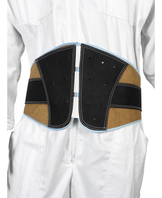 Cinturão de suporte lombar preto e castanho usado sobre macacão branco