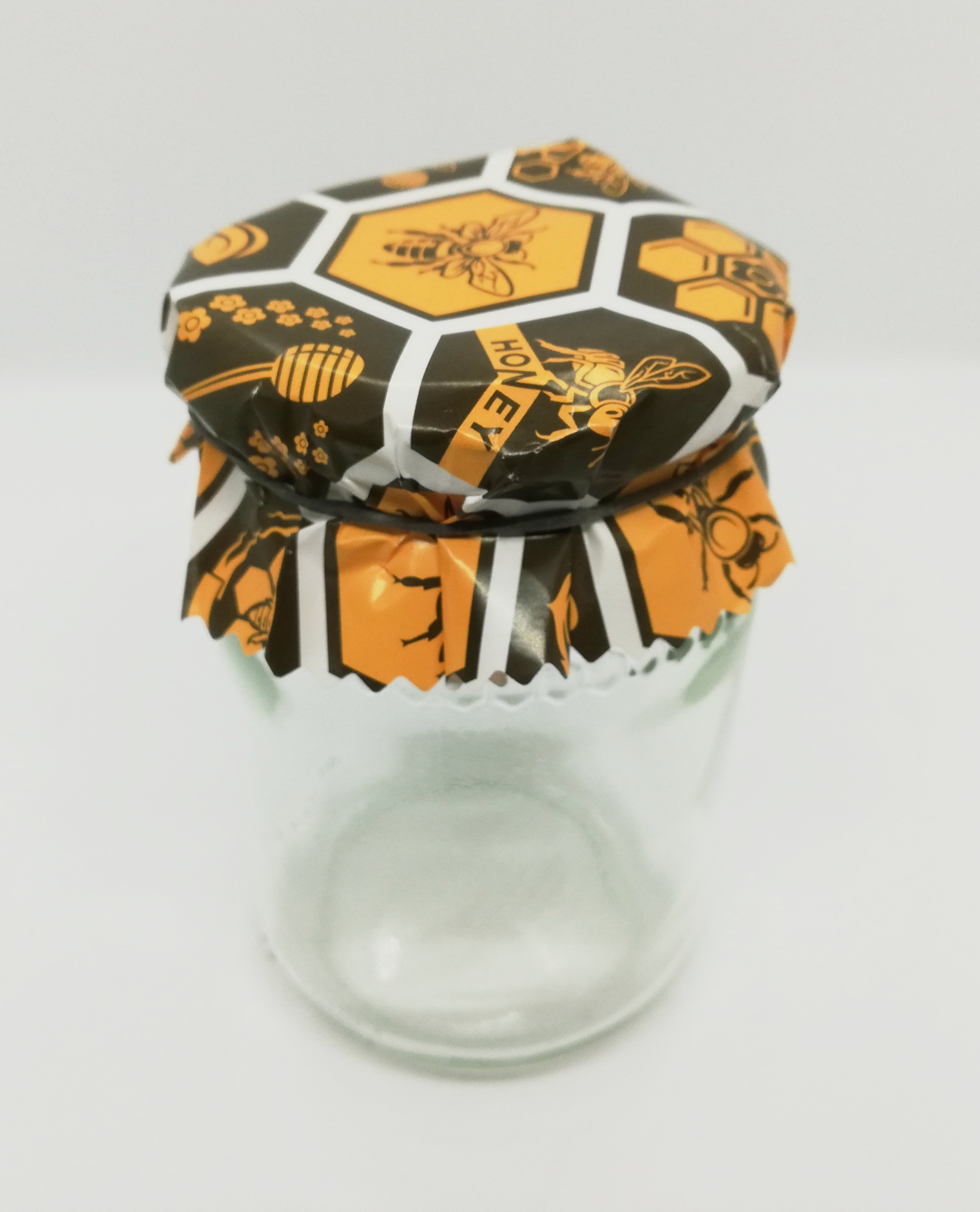 Frasco de vidro com tampa decorada com padrão de abelhas e texto HONEY