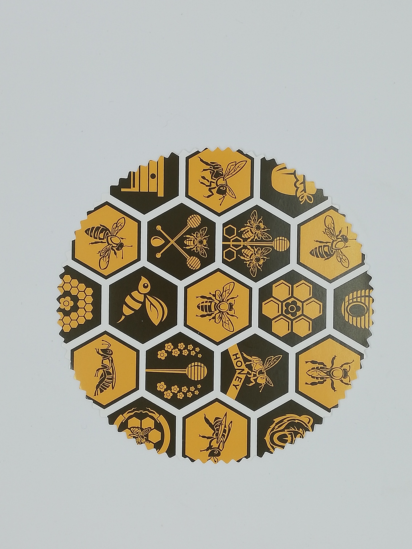 Disco redondo com ilustrações de abelhas e favos de mel em hexágonos amarelos e pretos