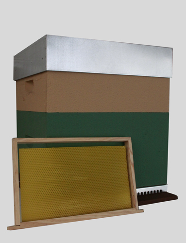 Colmeia de abelhas com tampa metálica e quadro de cera