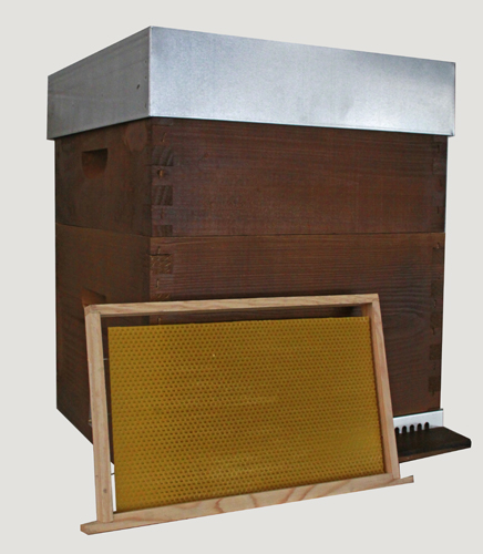 Caixa de colmeia de madeira com tampa metálica e quadro de cera de abelha