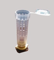 Suporte plástico translúcido com tampa articulada branca e base marrom