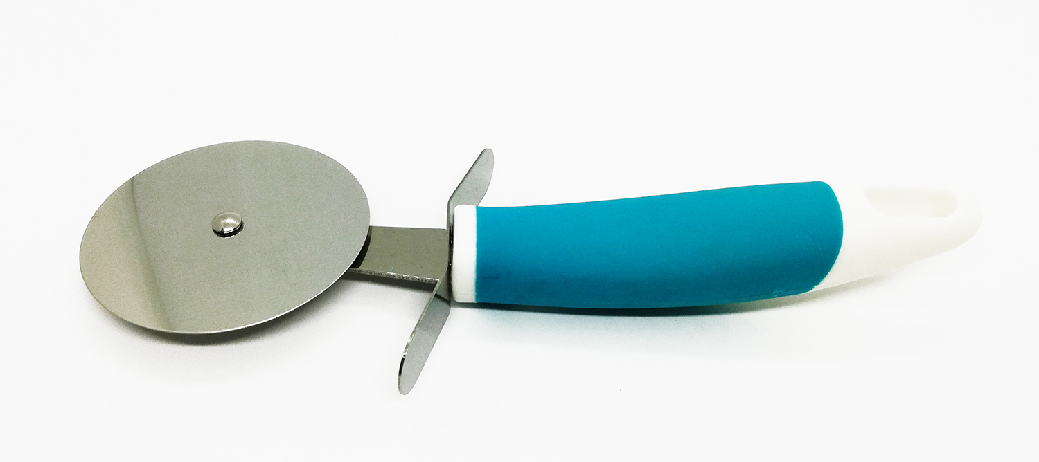 Cortador de pizza com lâmina circular e cabo azul e branco