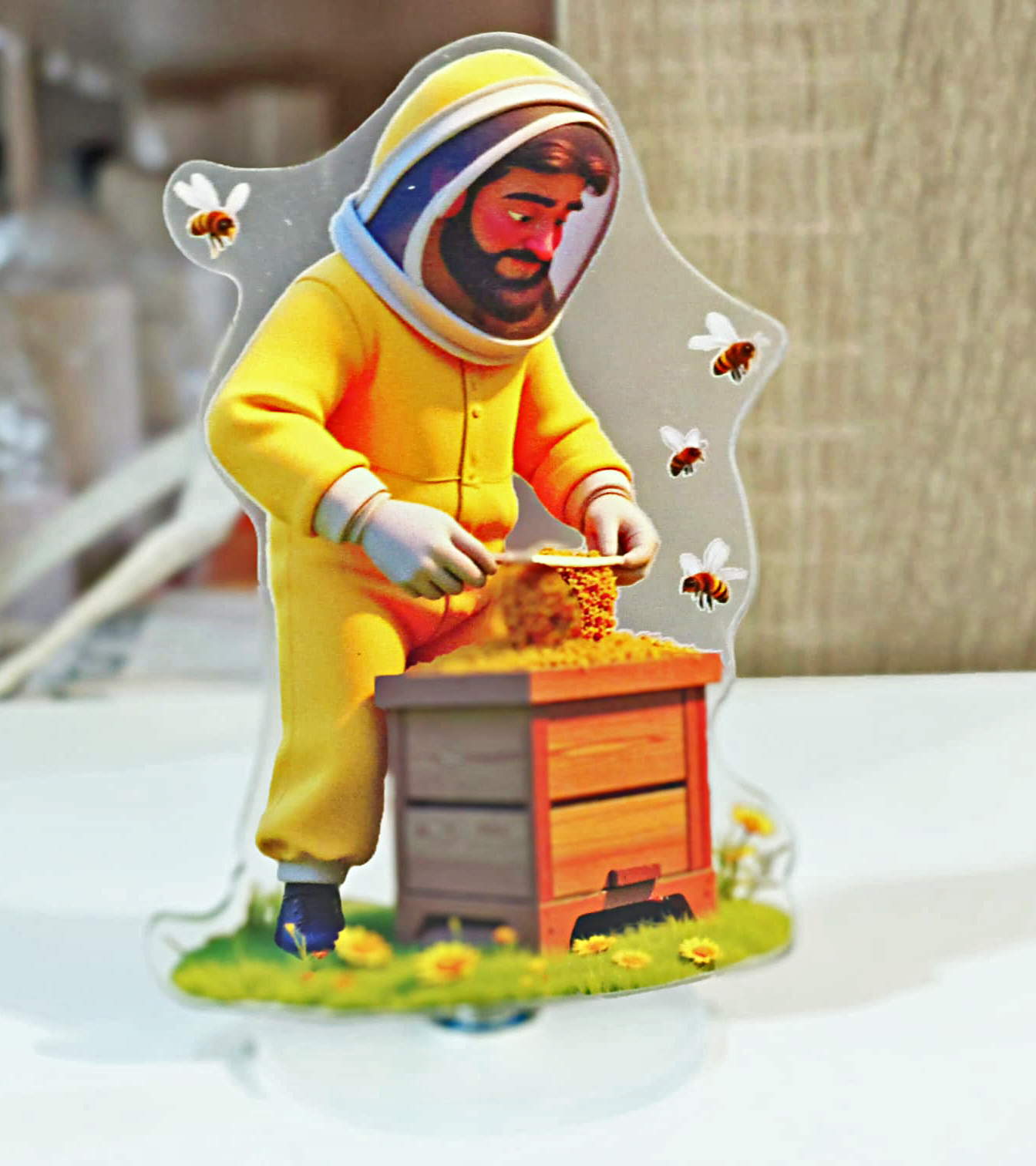Figura de acrílico de apicultor com fato amarelo e colmeia de madeira