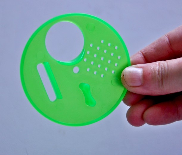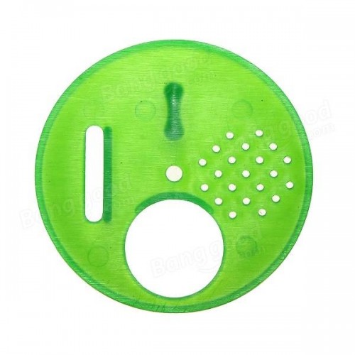 Placa redonda verde transparente em plástico com furos e ranhura