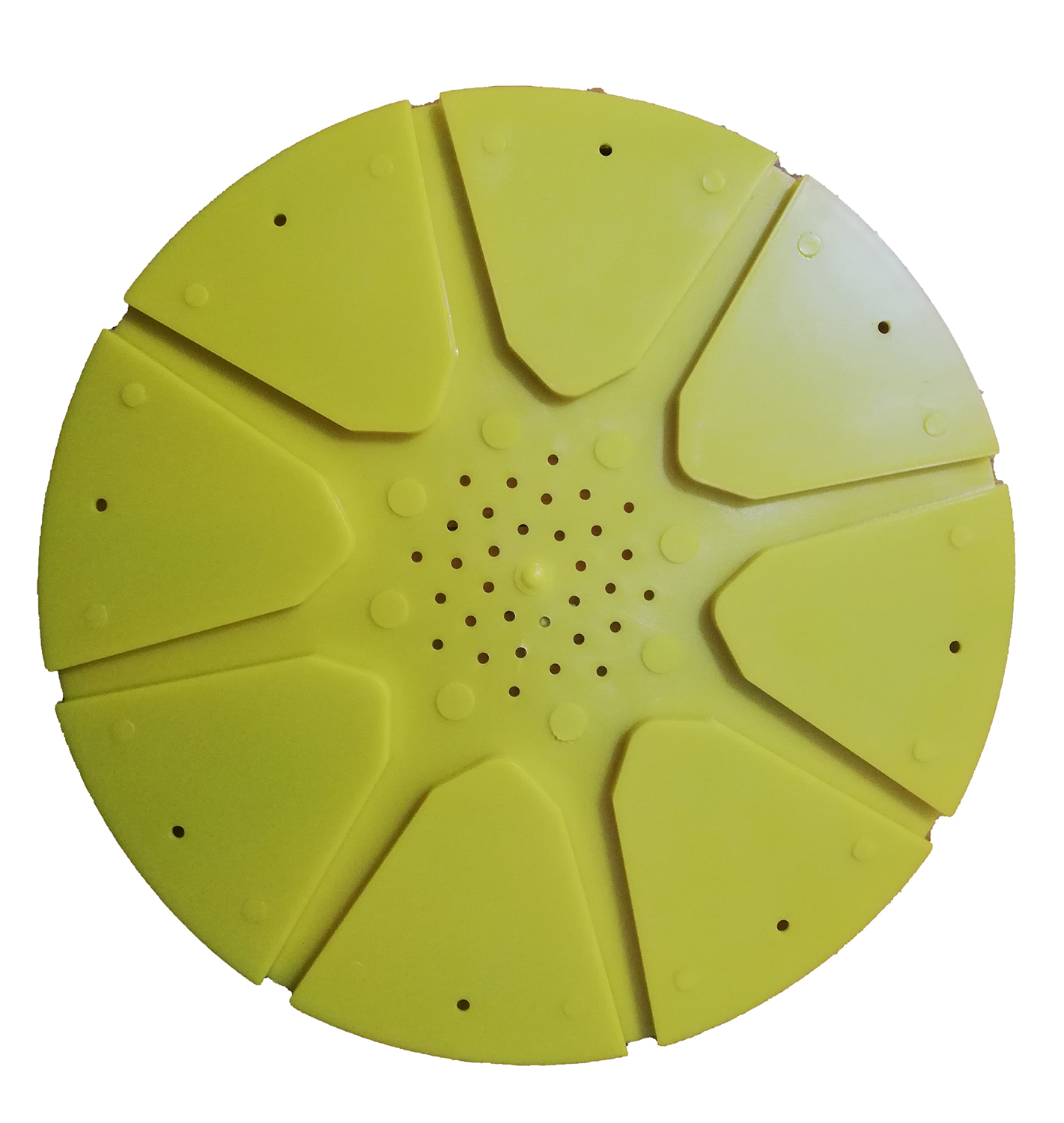 Divisória redonda amarela em plástico com oito segmentos e furos.