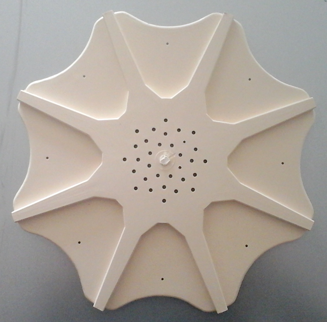 Objeto branco circular com oito secções e furos no centro sobre superfície cinzenta