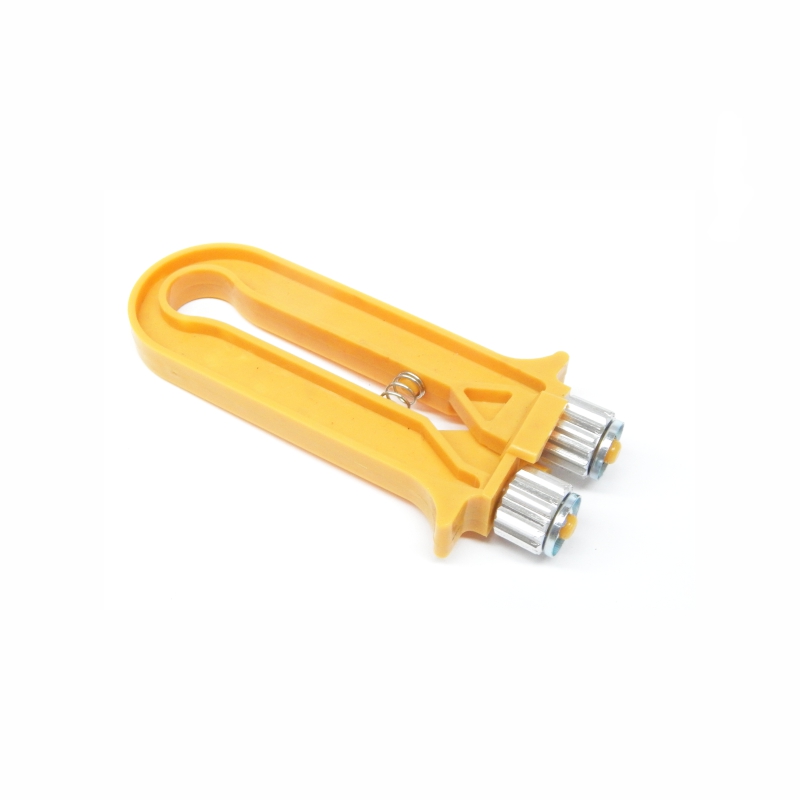ferramenta pequena amarela com mola e extremidades metálicas