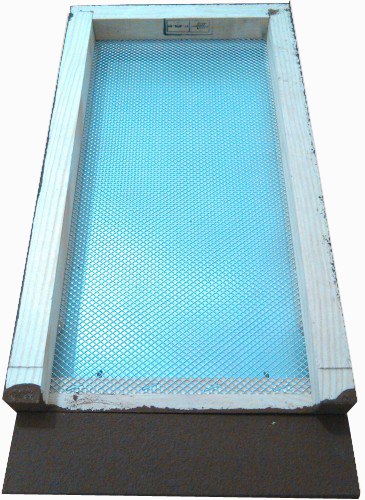 Estrutura retangular de madeira com malha metálica prateada no interior