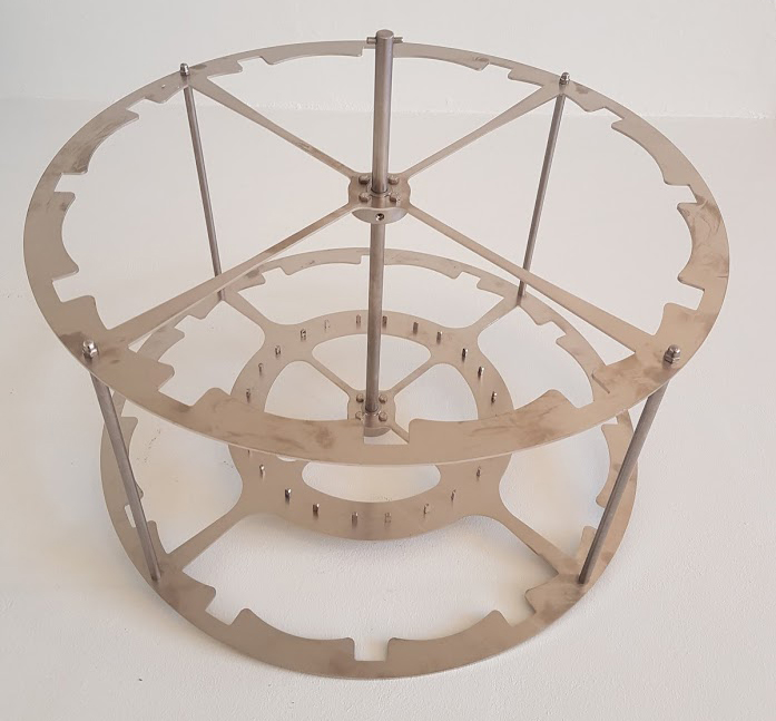 Estrutura metálica circular prateada com barras verticais e diagonais