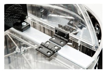 Dobradiça metálica preta fixada numa barra de alumínio numa estrutura transparente curva