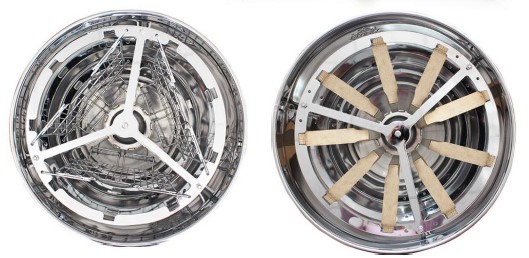 Dois queimadores redondos metálicos para fogão com suportes brancos e em madeira