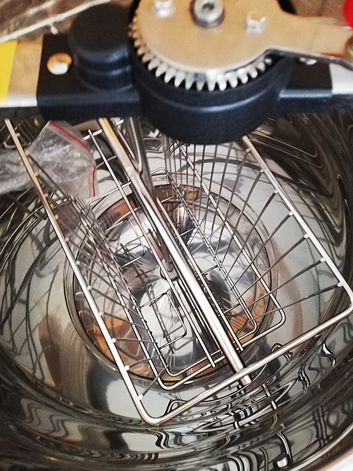 Centrífuga de favo de mel metal inox com tampa transparente e manivela vermelha