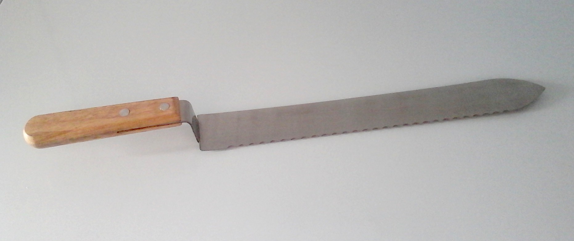 Faca de cozinha com lâmina longa e punho de madeira clara.