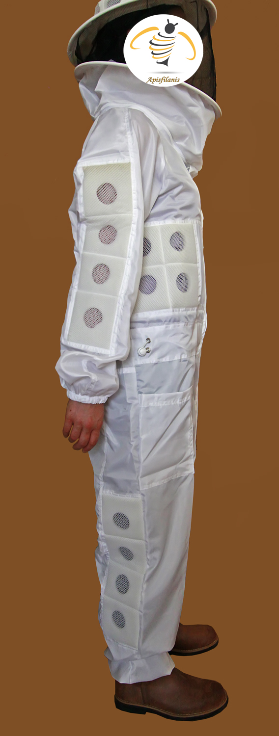 Fato de apicultura branco com máscara preta e logótipo de abelha Apisflanis