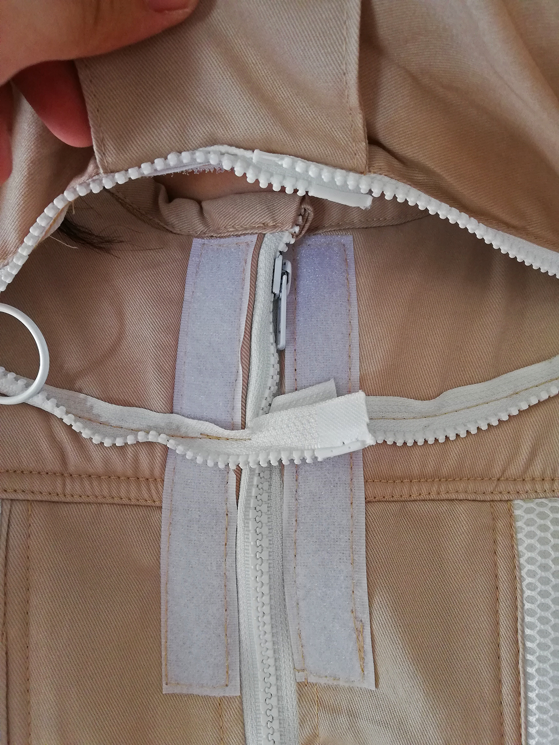Casaco bege com fecho éclair branco e velcro na parte interna.