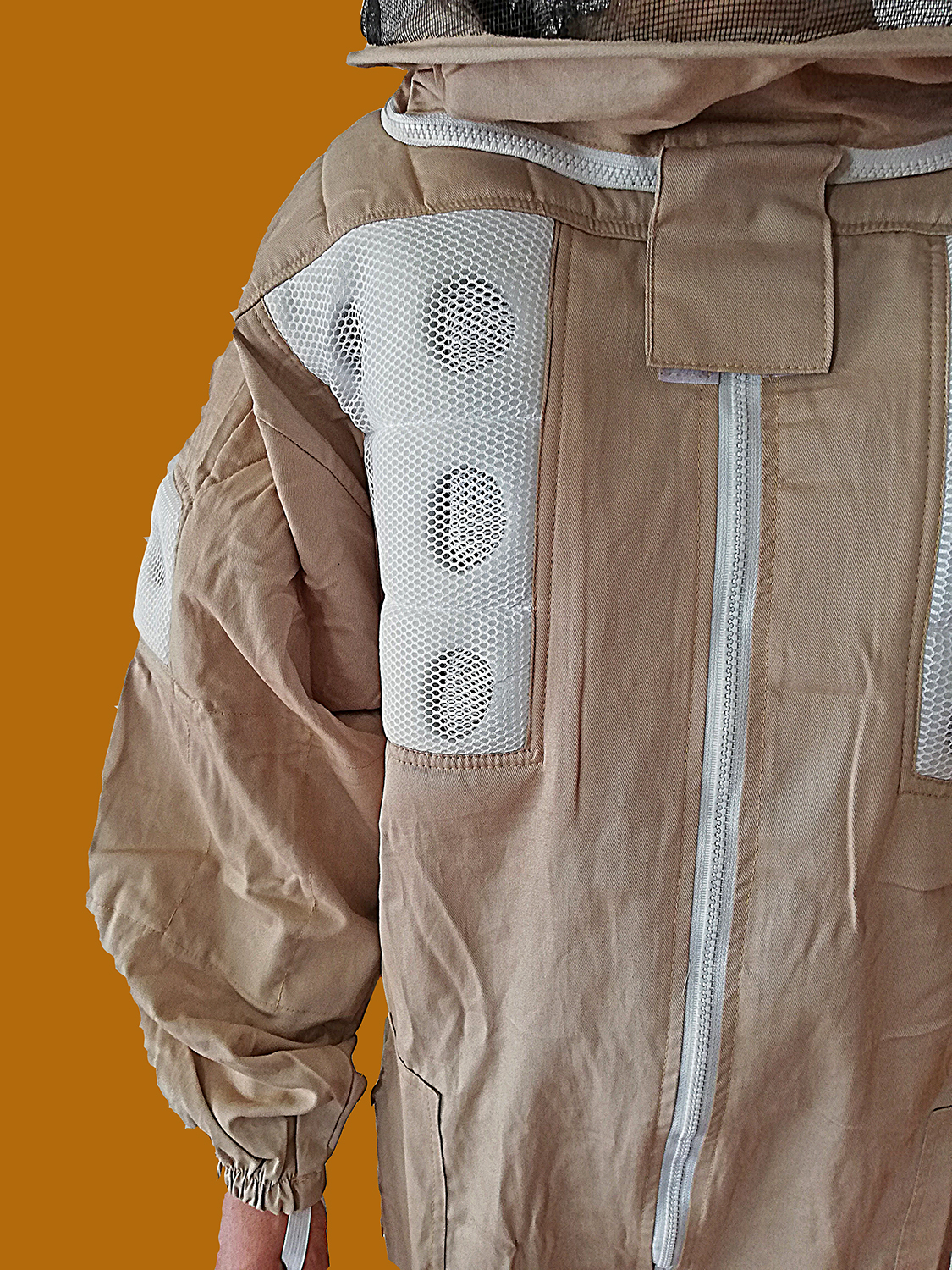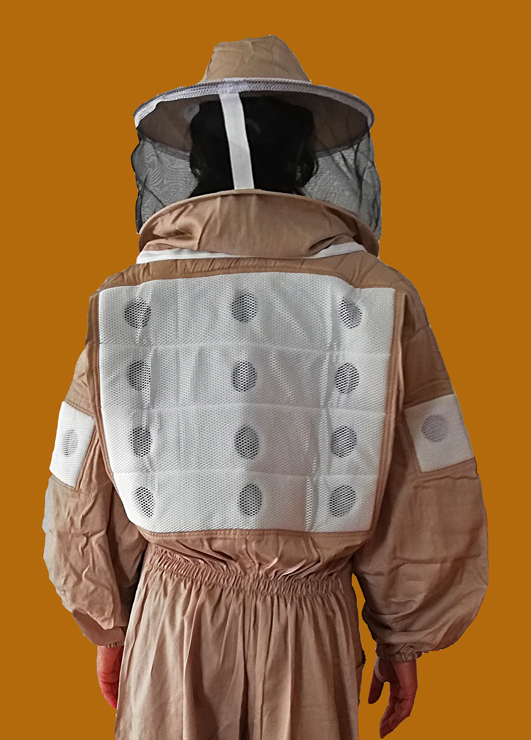 Pessoa de costas com fato de apicultura bege e rede de proteção preta
