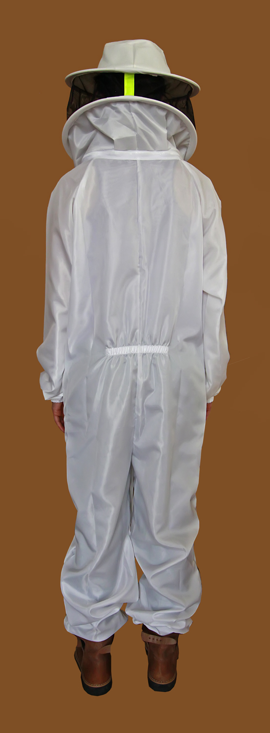 Macacão de apicultor branco com rede negra e faixa amarela no capuz, visto de costas