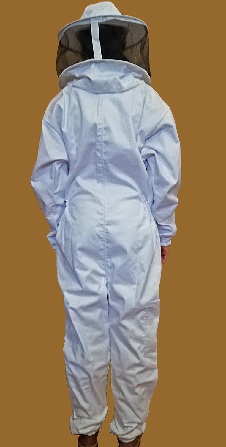 Macacão branco de apicultor com capuz e viseira de tela preta, vista traseira