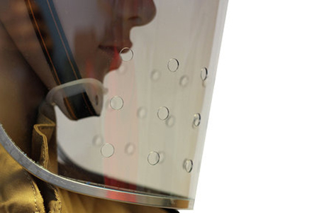 • Capacete ajustável com roda giratória homogado e visor de policarbonato com reforço de alumínio adaptado ao capacete e orifícios para ventilação.