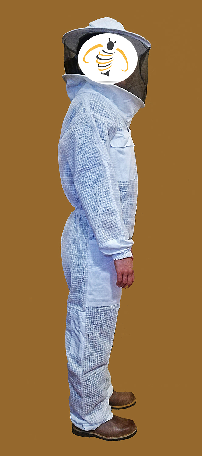 Pessoa a usar fato de apicultor branco com proteção de malha preta e chapéu